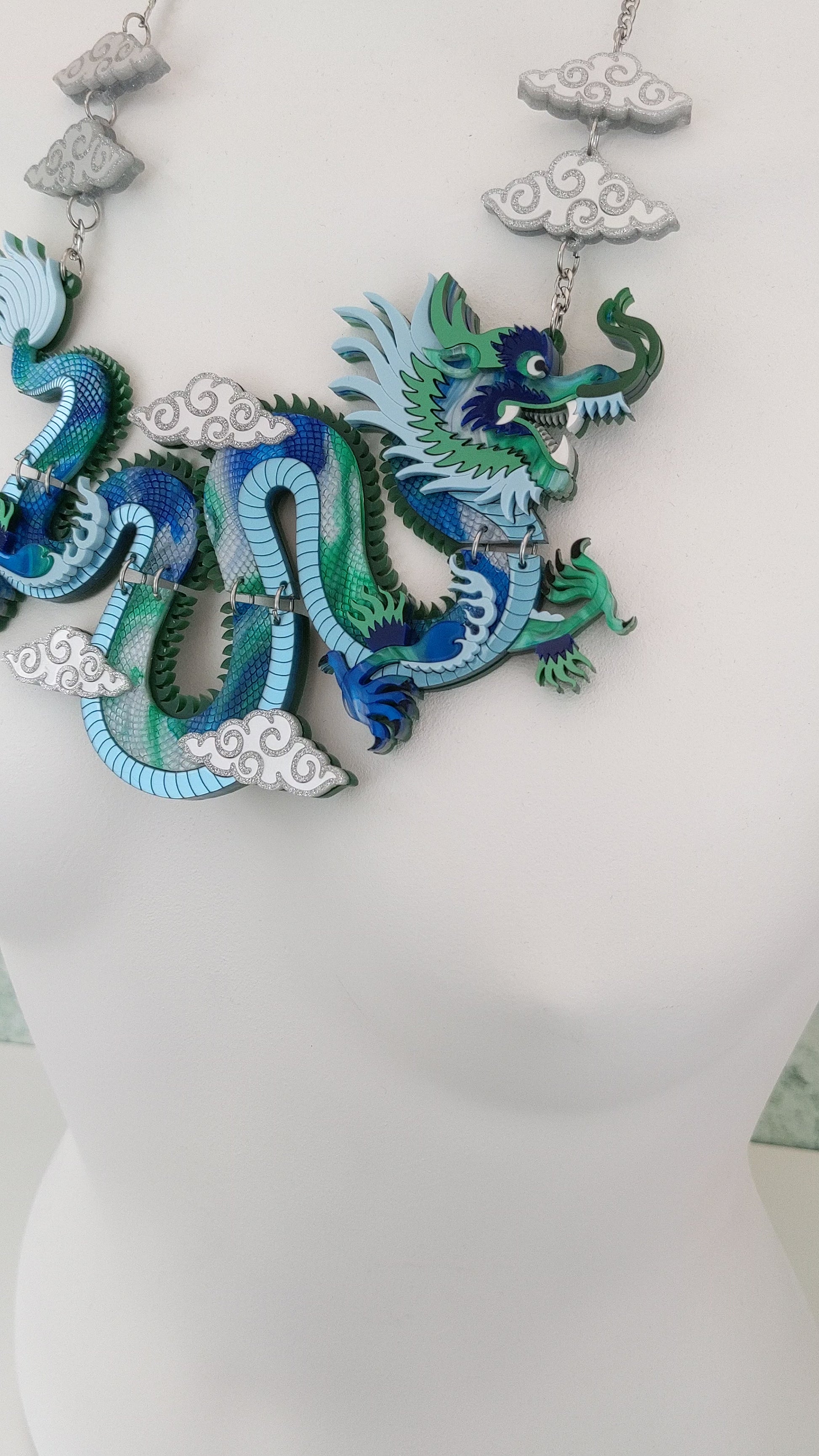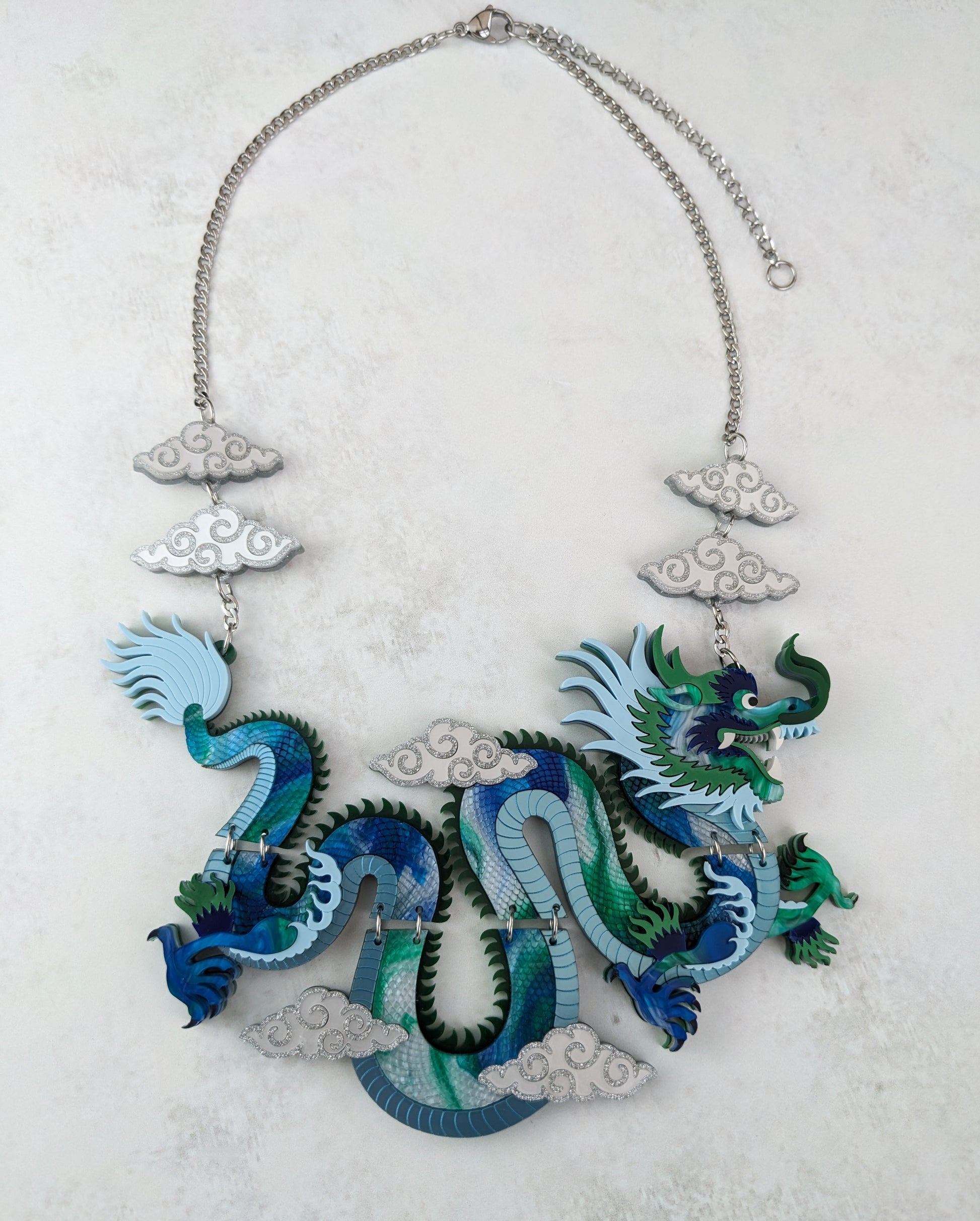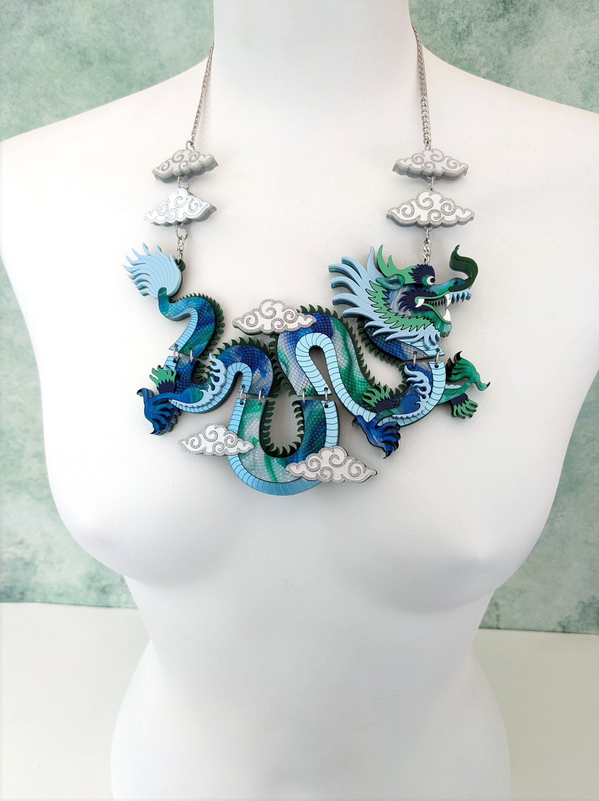 PRE ORDER Statement Chinese Dragon Necklace With Clouds BLUE/GREEN