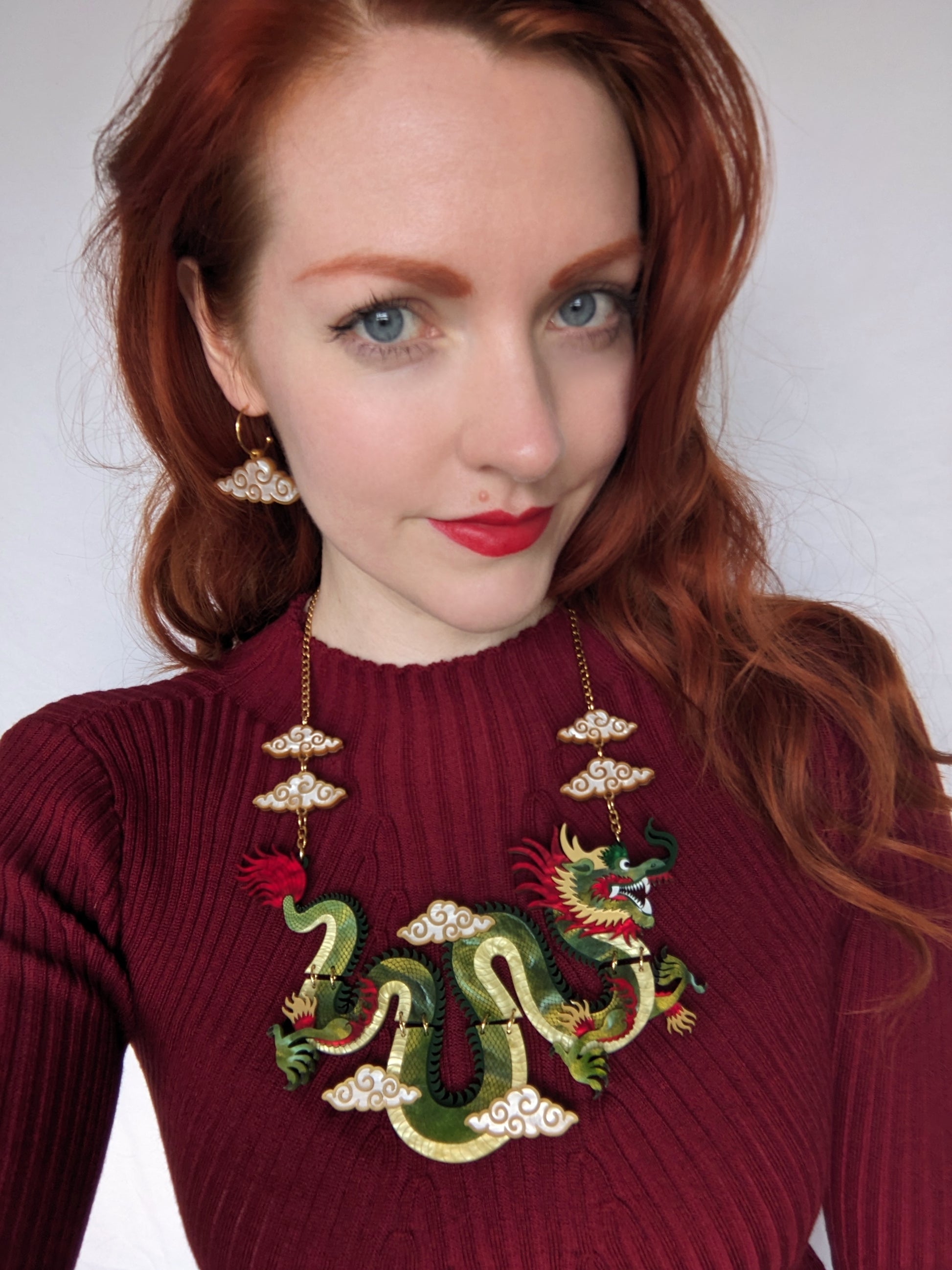 I've always admired Chinese dragons and Lunar year of the dragon was the perfect time to design one! Chinese dragons don't tend to breathe fire, they breathe clouds instead so you'll often see them surrounded by clouds and flying around in the air. This was the first colourway I made so it'll always be quite special to me. I'd say it's maybe the most traditional of the ones released so far and it is the most sophisticated looking dragon necklace. It's a decadent yet quite subtly coloured piece and I would say is the most versatile of the dragons in terms of what colours you can wear it with.