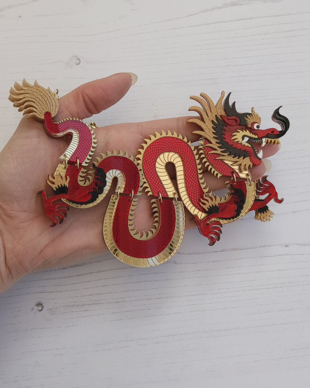 I've always admired Chinese dragons and Lunar year of the dragon was the perfect time to design one! Chinese dragons don't tend to breathe fire, they breathe clouds instead so you'll often see them surrounded by clouds and flying around in the air. The colour red is very prominent in Chinese culture as well as gold tones so it's a really traditional looking piece. This version is also the most stand out of the colourways so far. It will certainly draw attention to the wearer! I've pushed myself really hard with this collection and I've spent quite some time on it to get it right. I hope you like the designs!