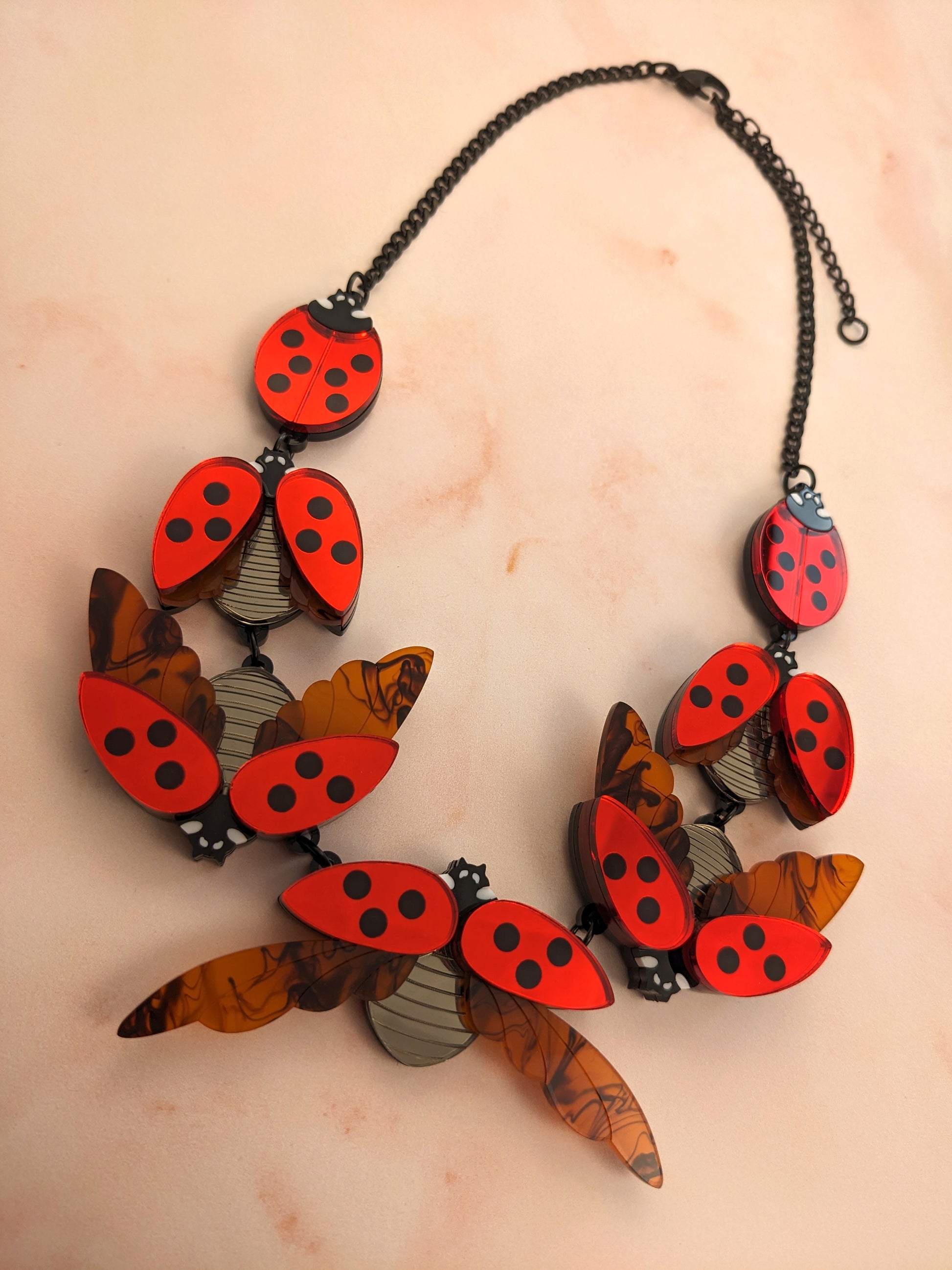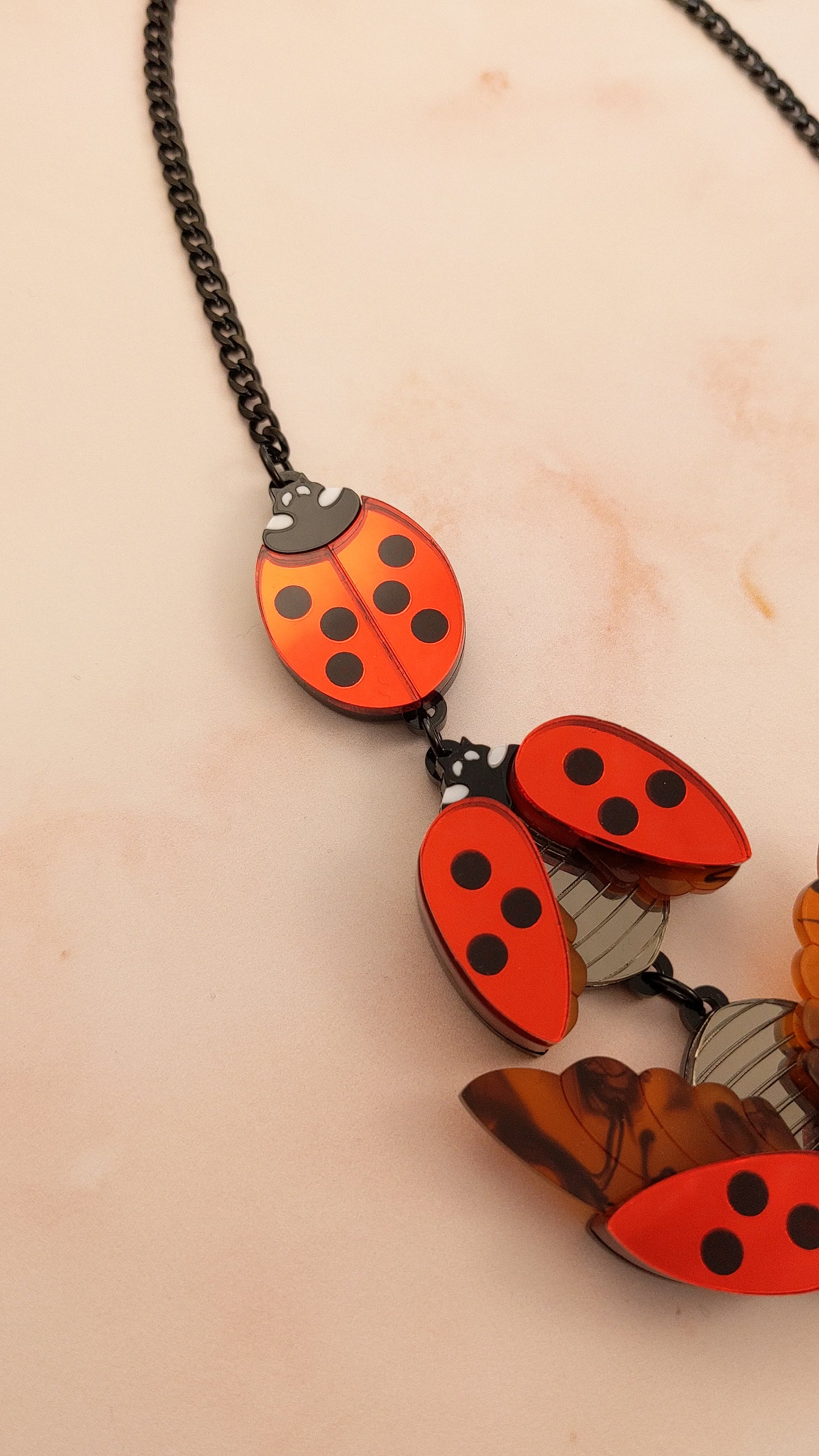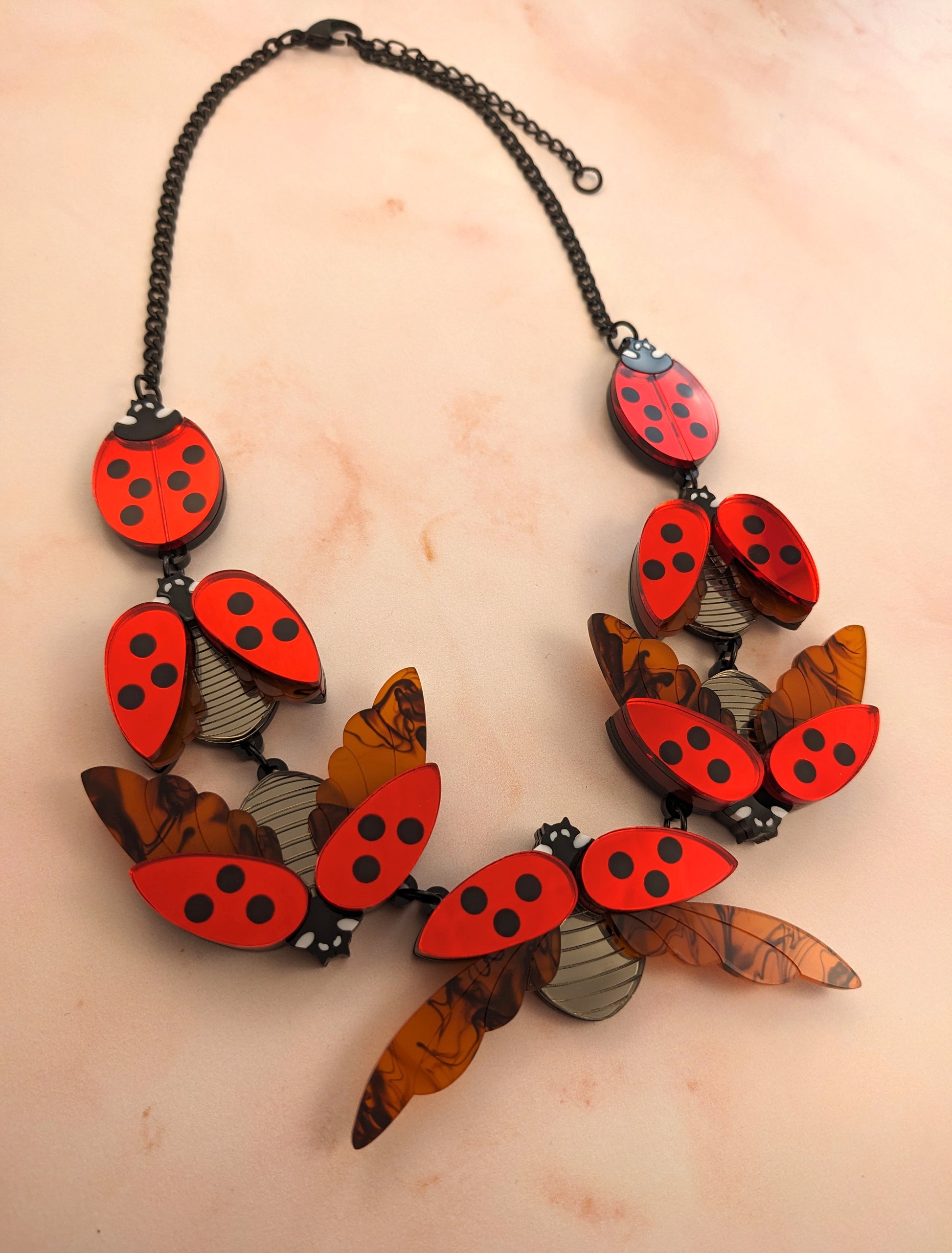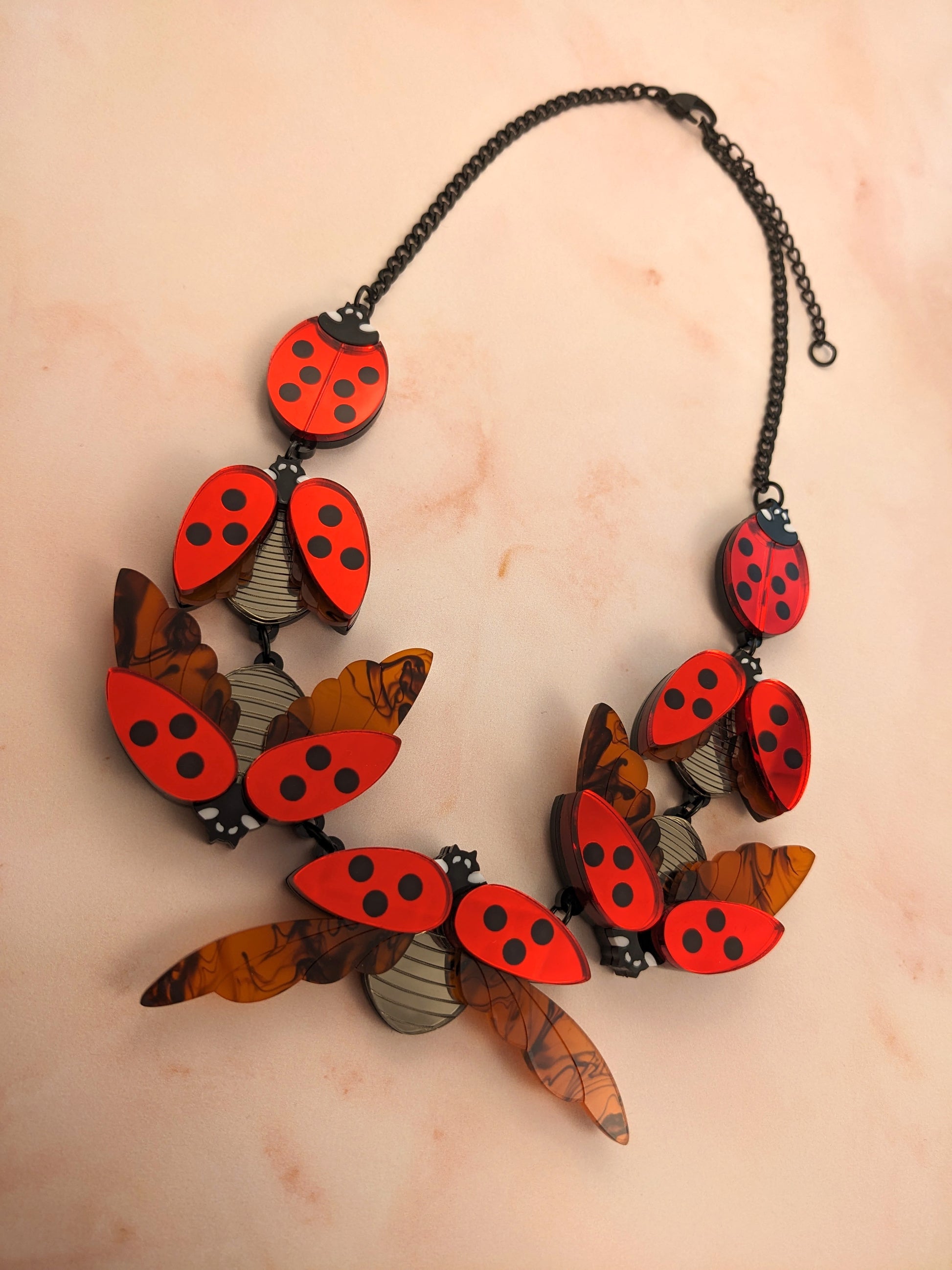 This statement ladybird necklace was inspired by my childhood love of ladybirds. I focused on the different wing stages when I designed this striking statement piece and it features 4 different wing stages over 7 separate ladybirds all in red mirror acrylic. I thought long and hard about the layering of these and realised that frosted red acrylic looks the same as mirror acrylic at the side so it was perfect for the layering of this piece to make them appear layered like real ladybirds. Each piece is quite chunky and is backed with 3mm black acrylic but it is surprisingly easy to wear. The outer coloured wings are made from red mirror acrylic and have engraved, painted black spots which are neatly sealed under the acrylic. The transparent wings have a likeness to real ladybird wings and are made from an ink/smoke like tortoishell acrylic, and the bodies are a greyish bronze mirror acrylic.