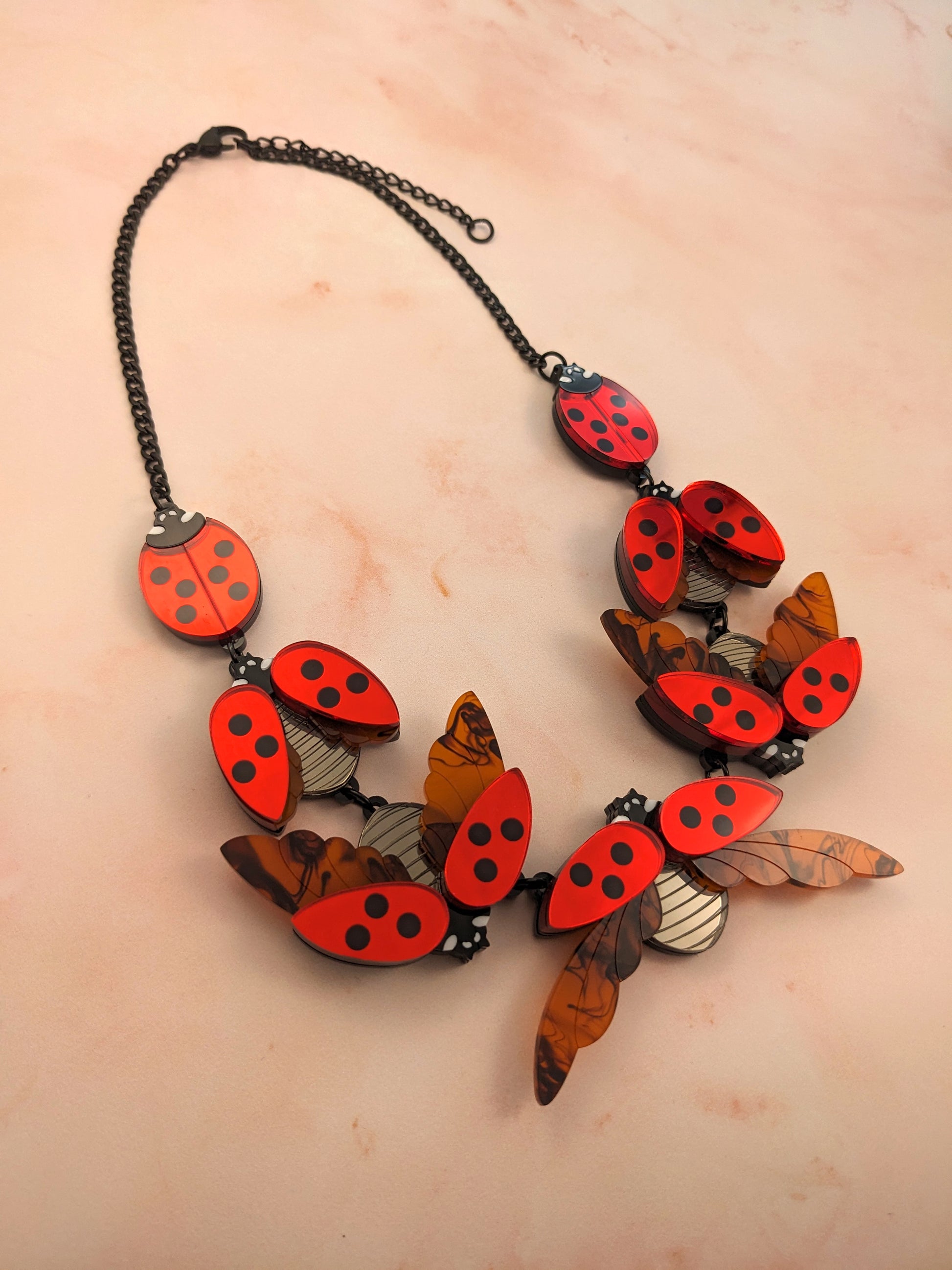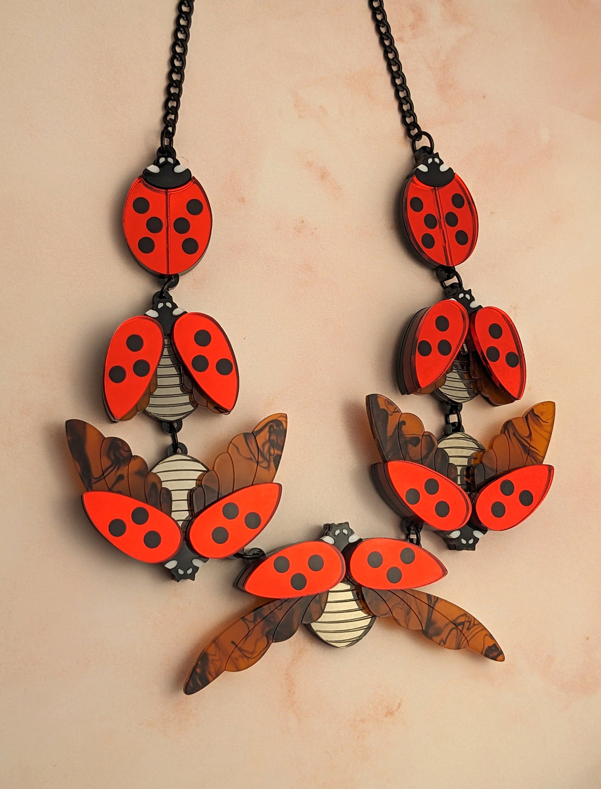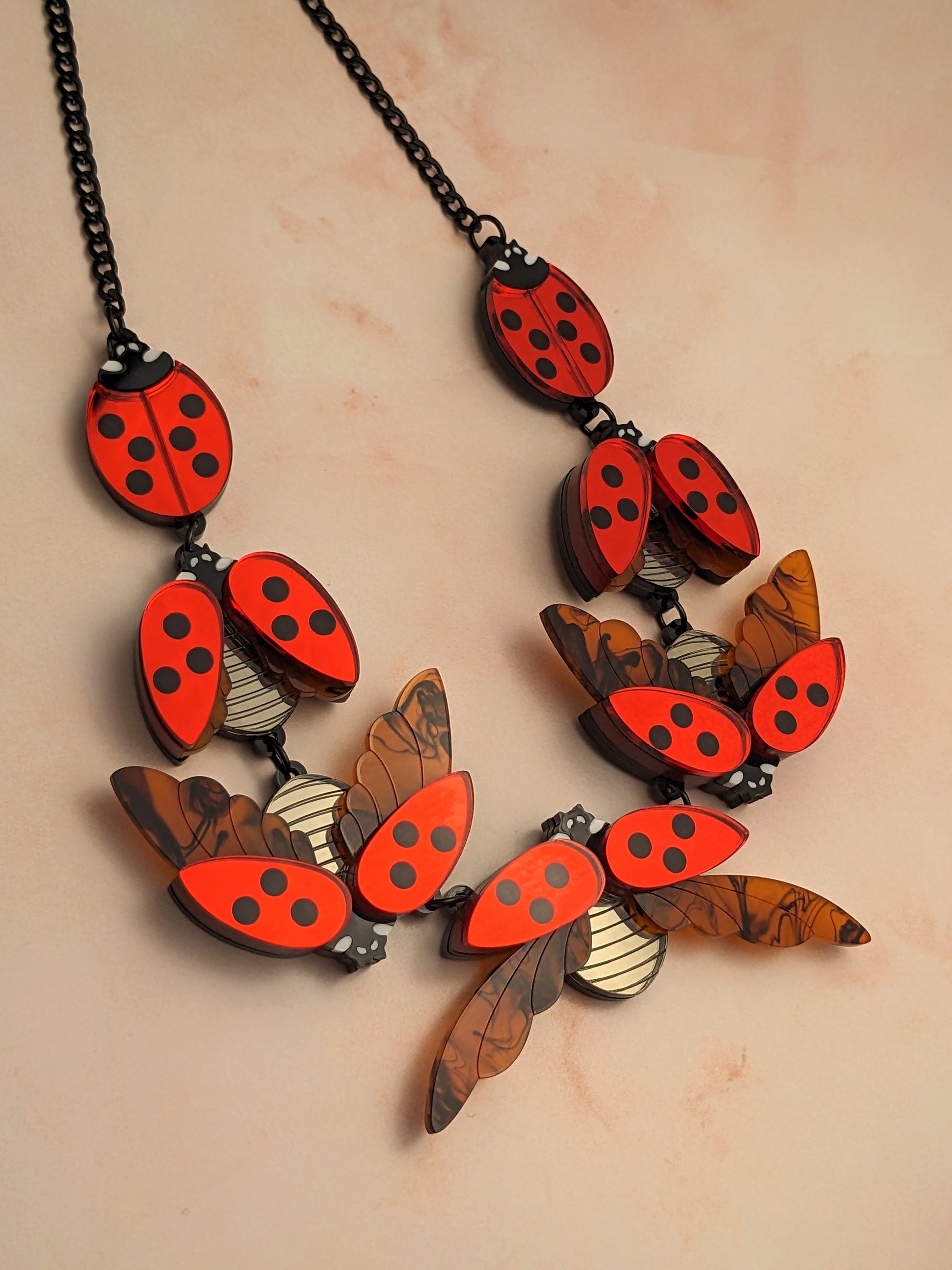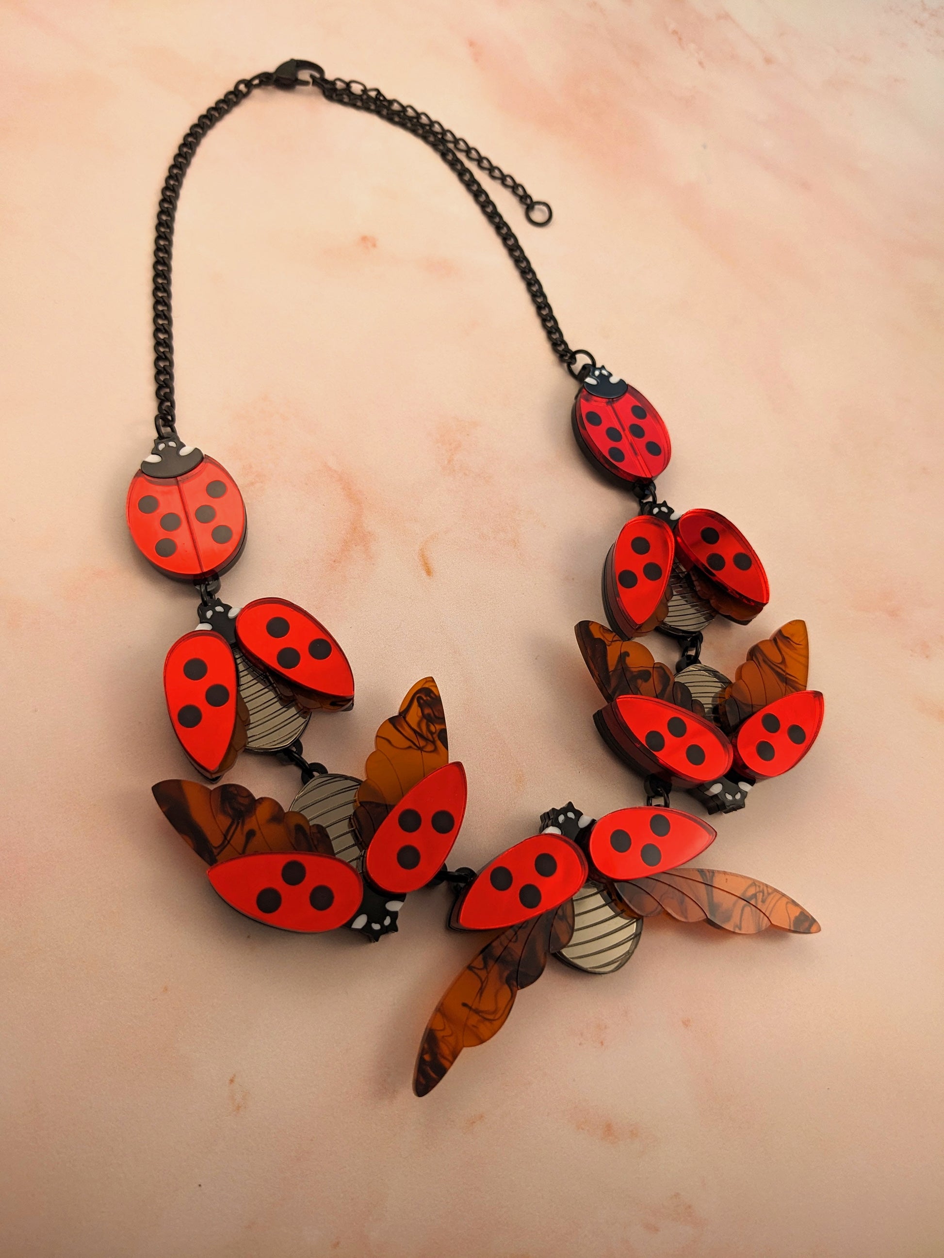 This statement ladybird necklace was inspired by my childhood love of ladybirds. I focused on the different wing stages when I designed this striking statement piece and it features 4 different wing stages over 7 separate ladybirds all in red mirror acrylic. I thought long and hard about the layering of these and realised that frosted red acrylic looks the same as mirror acrylic at the side so it was perfect for the layering of this piece to make them appear layered like real ladybirds. Each piece is quite chunky and is backed with 3mm black acrylic but it is surprisingly easy to wear. The outer coloured wings are made from red mirror acrylic and have engraved, painted black spots which are neatly sealed under the acrylic. The transparent wings have a likeness to real ladybird wings and are made from an ink/smoke like tortoishell acrylic, and the bodies are a greyish bronze mirror acrylic.
