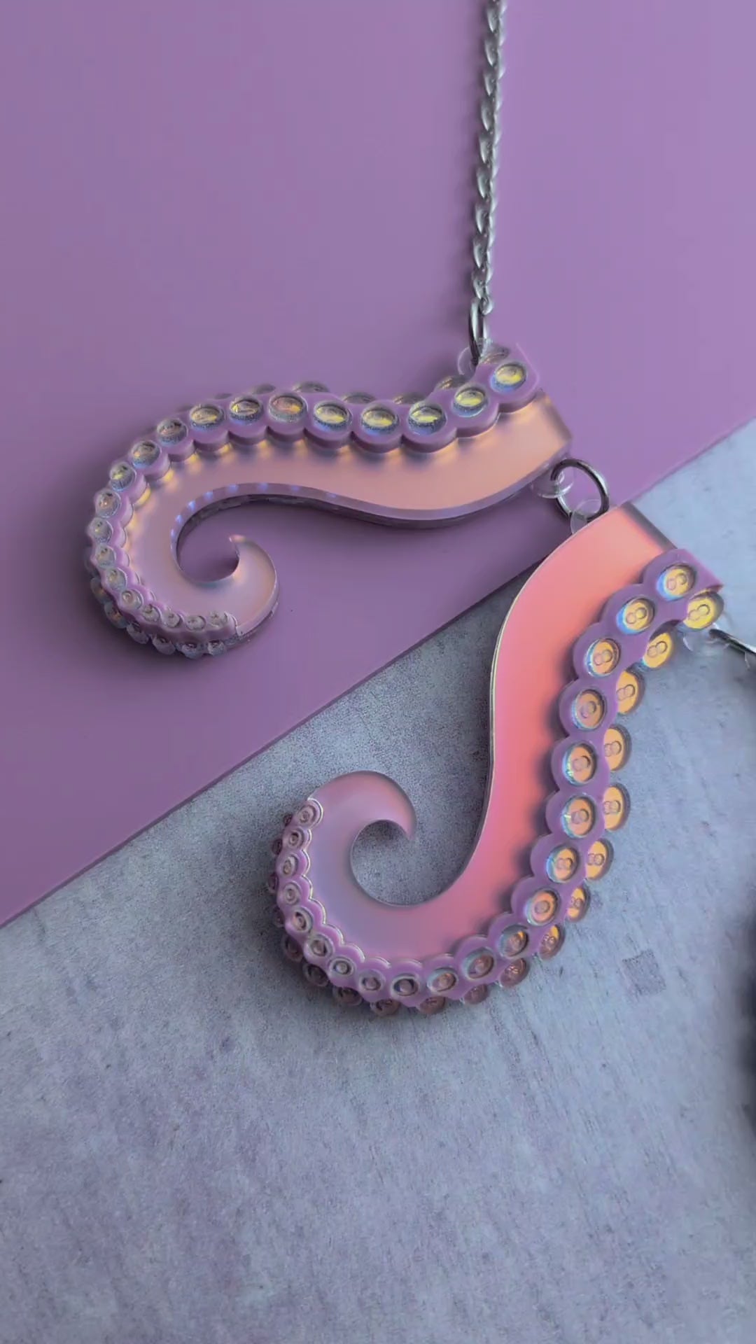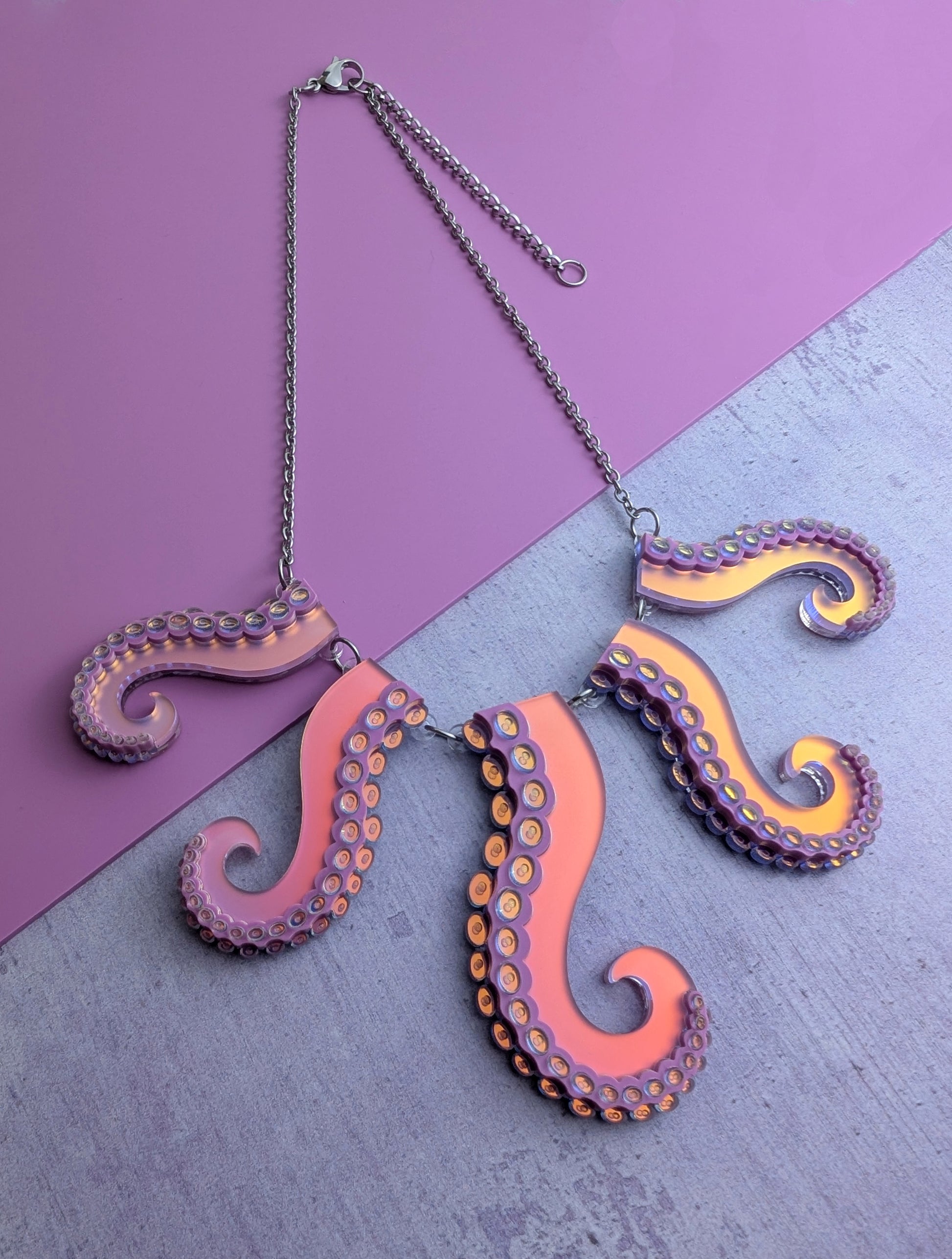 This tentacle necklace is a striking piece, suitable for any octopus or sea witch fan. Each tentacle consists of a striking frosted iridescent acrylic which has been customised/backed to create a more coral toned opaque acrylic which shines through all the colours of a moody sunset (blue, purple, pink, coral, orange and yellow) as it moves and shows differently in different lights. It's then accented with plain light purple Perspex as well as a gloss iridescent acrylic which has also been backed. The suckers are cleverly constructed and each oval is glued into a deep engraved setting to mimic the 3D look of a real tentacle. All hand assemble onto thin layers of clear acrylic to coordinate beautifully with the transparent edges of the iridescent acrylic. The clear backing, means that you can see the glue from the back but it means that it looks so much better from the front. The chain and findings are made from anti tarnish stainless steel so the jump rings won't need changing. Choose between gold plated and regular silver tone. I'm wearing the necklace on the shortest length in the photos and the chain measures approximately 35cm extending to 43cm. If you think you'll need extra length you can message me or leave me a note for a couple more inches of the main chain but I will say that the necklace can't really be worn any lower as I don't think it will sit right. Please note with this one that there may be slight variation in tone to the iridescent acrylic. Please also be careful not to scratch the underneath of the exposed iridescent acrylic backing underneath on the sucker parts as like the backing on mirrored acrylic, rough handling can cause it to scratch off. It doesn't touch any surfaces when it's laid flat though so it should be okay, especially if stored on it'd foam pad in the box it will arrive in. The inserts in the sucker sections are glued securely and will be double checked before shipping but obviously if they're prodded roughly, they may come loose so please handle carefully.