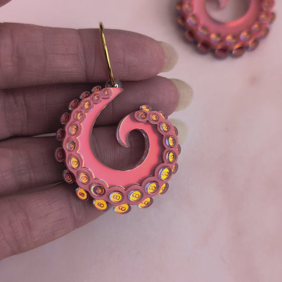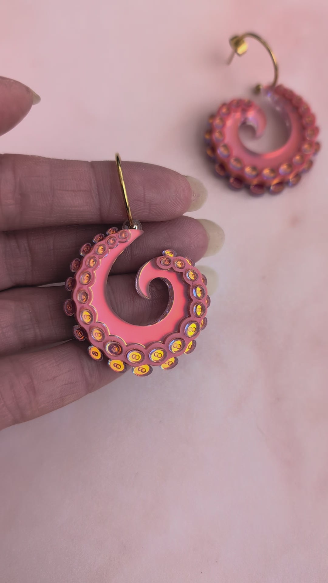 These tentacurl earrings were inspired by the tentacles of an octopus but they are abstract enough that they could be worn without being associated with octopus. Measuring in at approximately 3.9cm(h) x 3.6cm(w) (without the hoop). Each earring consists of a striking frosted iridescent acrylic which has been customised/backed to create a more coral toned opaque acrylic which shines through all the colours of a sunset (light red, purplish pink, coral, orange and yellow) as it moves and shows differently in different lights. It's then accented with plain coral Perspex as well as a gloss iridescent acrylic which has also been backed - (deep pink). All hand assemble onto thin layers of clear acrylic to coordinate beautifully with the transparent edges of the iridescent acrylic. The clear backing, means that you can see the glue from the back but it looks so much better than opaque acrylic did from the front. Choose between gold plated and regular silver tone stainless steel hoops, Please also be careful not to scratch the underneath of the exposed iridescent acrylic backing underneath on the sucker parts as like the backing on mirrored acrylic, rough handling can cause it to scratch off. It doesn't touch any surfaces when they're laid flat though so they should be okay, especially if stored on the foam pad in the box they will arrive in. The inserts in the sucker sections are glued securely and will be double checked before shipping but obviously if they're prodded roughly, they may come loose so please handle carefully.