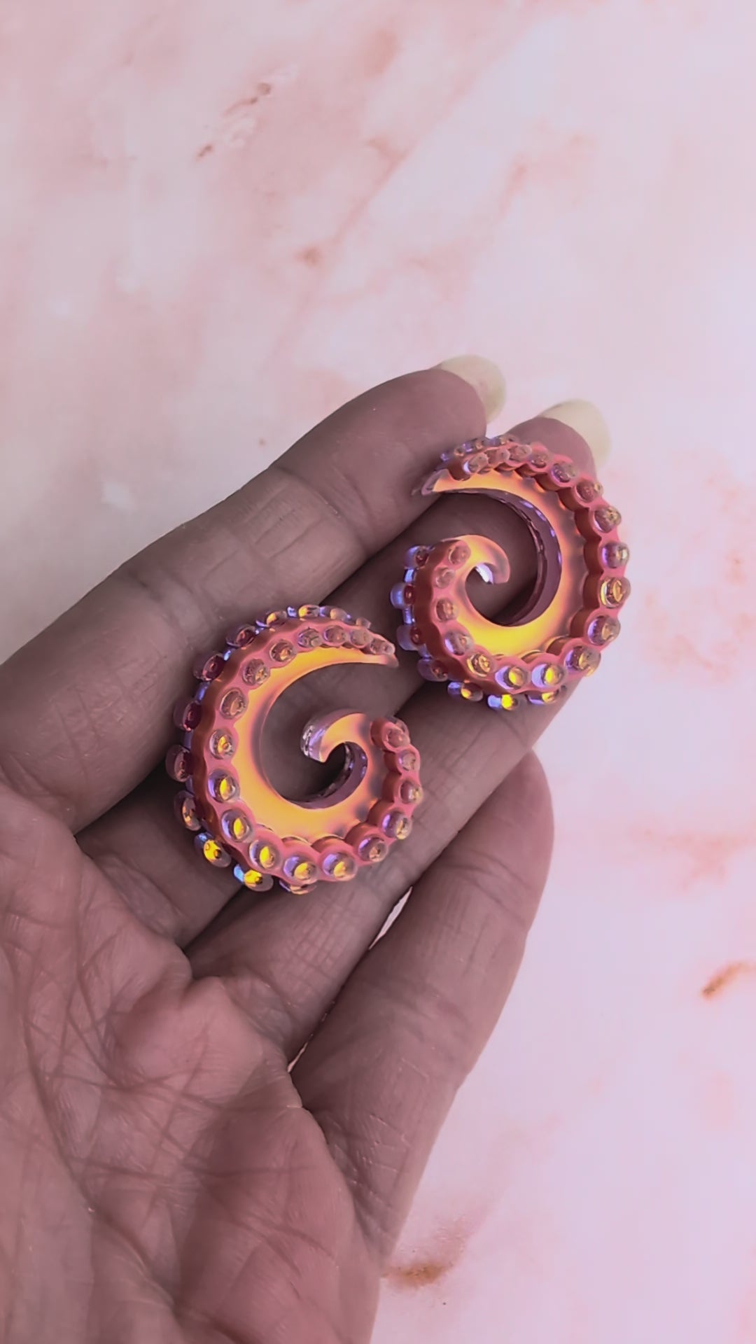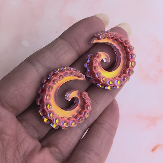 These tentacurl earrings were inspired by the tentacles of an octopus but they are abstract enough that they could be worn without being associated with octopus. Measuring in at approximately 2.8cm(h) x 2.6cm(w) (at the angle they're worn at). Each earring consists of a striking frosted iridescent acrylic which has been customised/backed to create a more coral toned opaque acrylic which shines through all the colours of a sunset (light red, purplish pink, coral, orange and yellow) as it moves and shows differently in different lights. It's then accented with plain coral Perspex as well as a gloss iridescent acrylic which has also been backed - (deep pink). All hand assemble onto thin layers of clear acrylic to coordinate beautifully with the transparent edges of the iridescent acrylic. The clear backing, means that you can see the glue from the back but it looks so much better than opaque acrylic did from the front. They're light and comfortable to wear and can be worn either way.