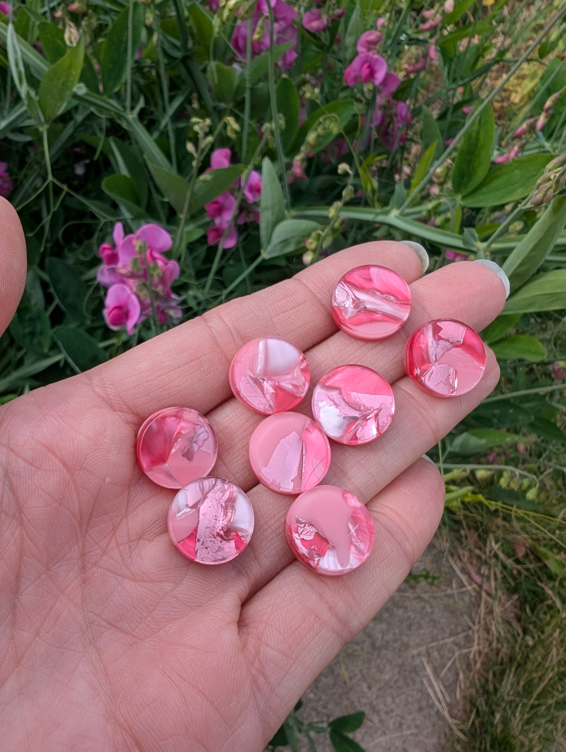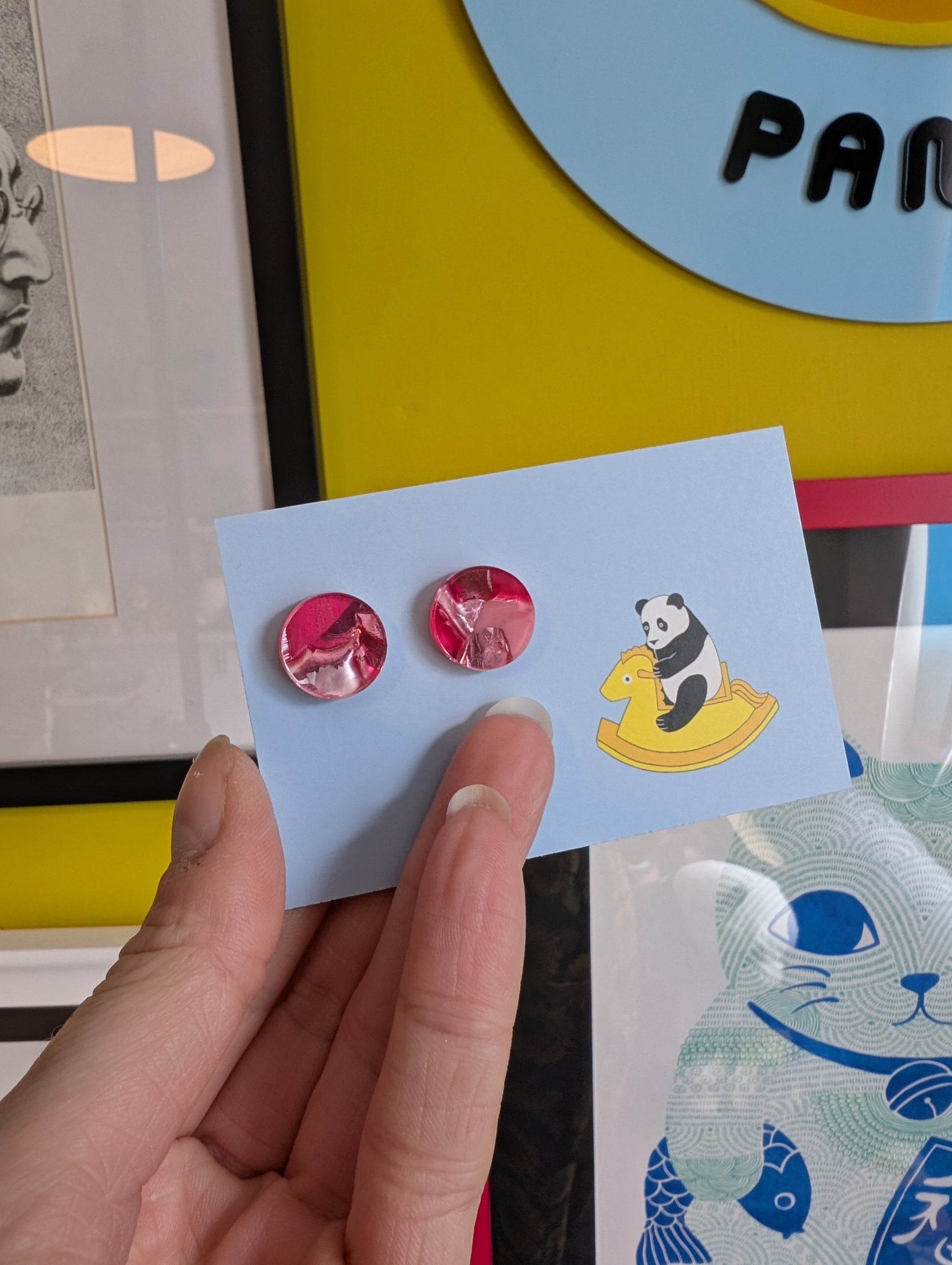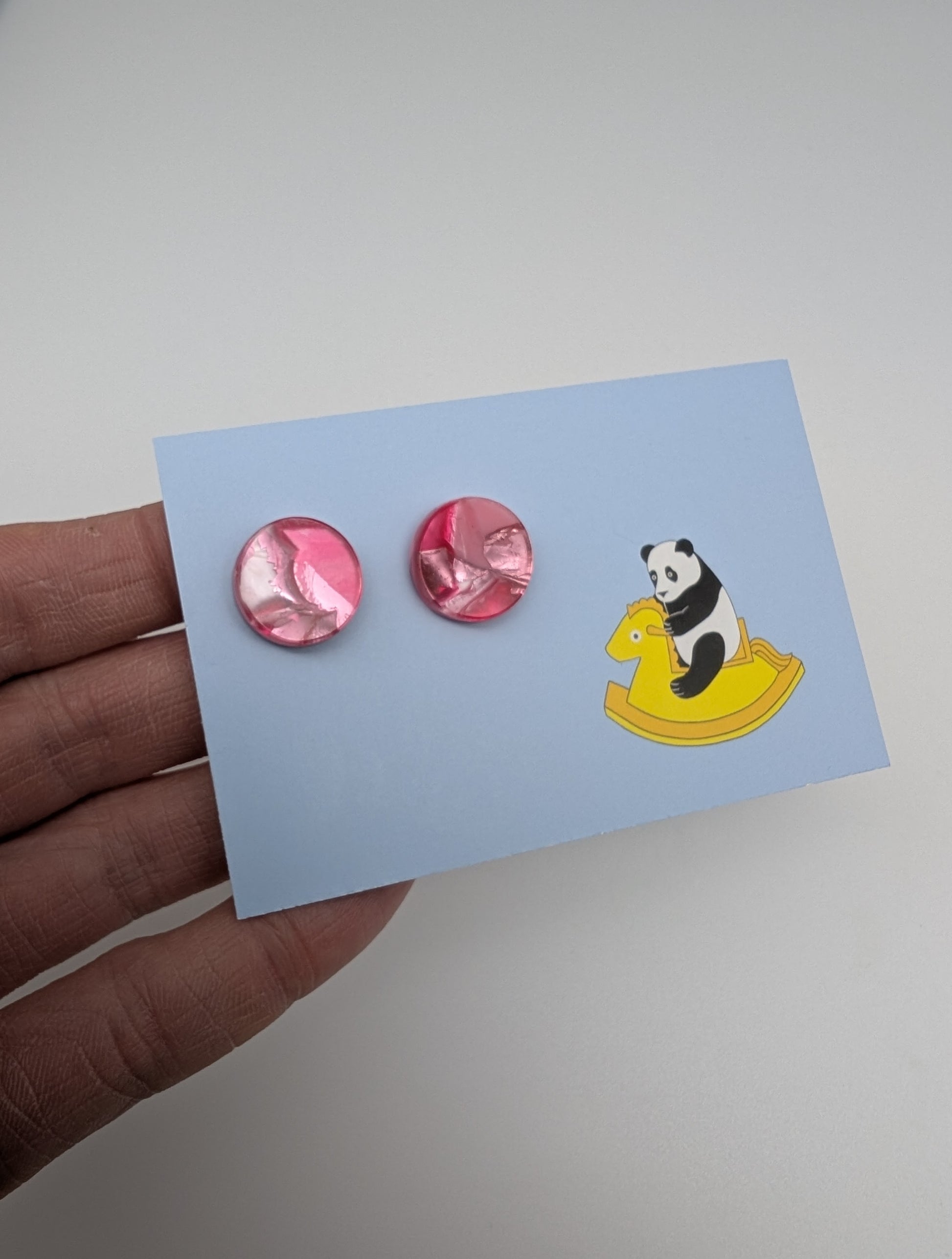 These are some extra recycled stud earrings cut from the same sheets for the butterflies. They measure 14mmx14mm and have surgical steel posts and butterfly backs. There's 3 different pink offcuts that go into making the sheet for these as well as a pink foil and each one will be unique though I try to pair them up nicely.